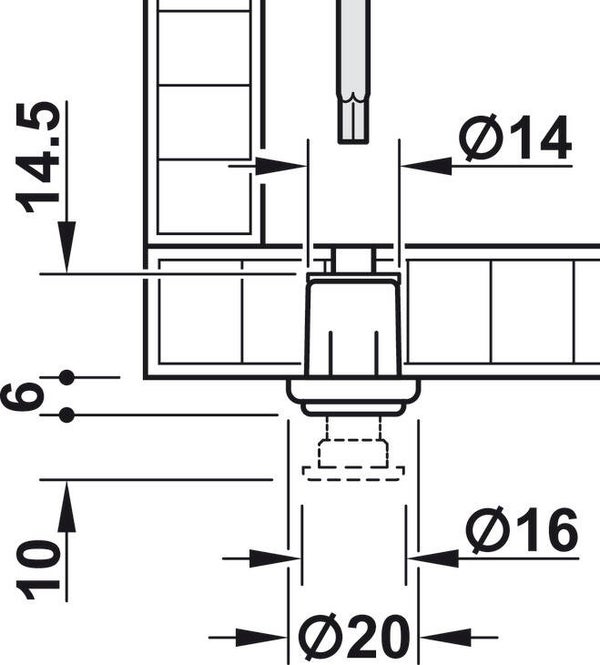 Deze robuuste plinthoogteversteller is ontworpen voor inbouw in meubelplaten, wat zorgt voor een nagenoeg onzichtbare en stabiele afstelling van uw plint.