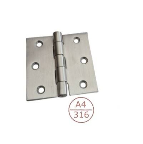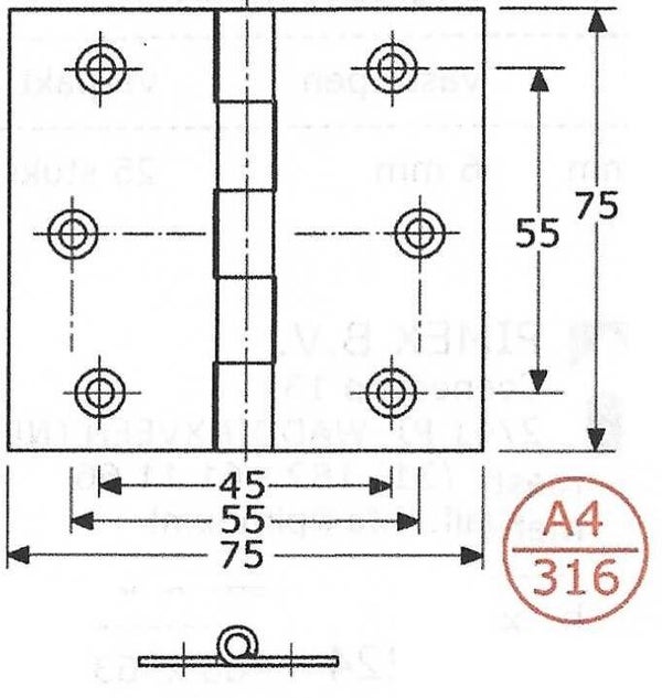 Scharnier met vast pen 75x75x2.5mm en 3 schroefgaten per blad, vervaardigd uit RVS316/A4, is een robuust en corrosiebestendig scharnier dat geschikt is voor veeleisende toepassingen. RVS316 (Roestvast Staal 316): Dit is een hoogwaardige roestvaststaalsoort die bekend staat om zijn uitstekende corrosiebestendigheid.