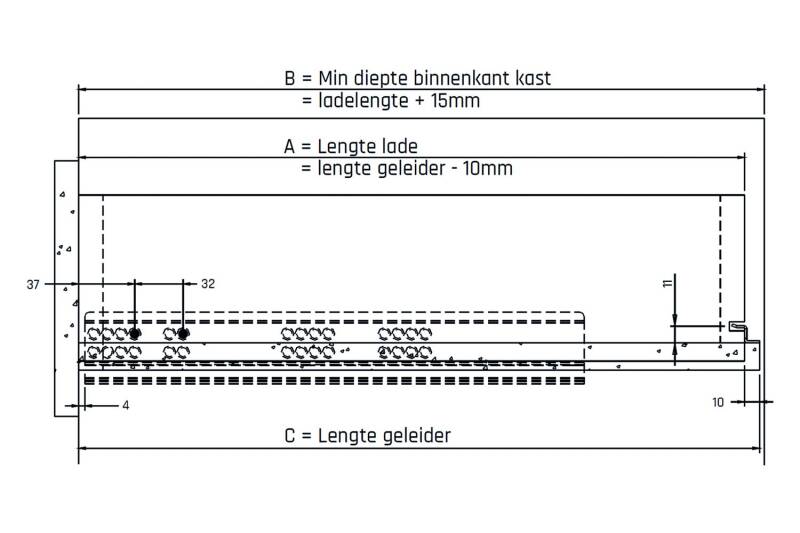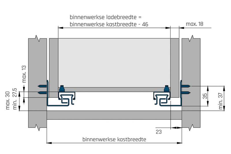 - Bevestiging van de lade op de ladegeleiders d.m.v. kunststof clips met 3D verstelling