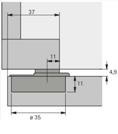 Het Optimat Plus scharnier is te gebruiken voor alle kaderbreedtes. Geschikt voor deurdiktes vanaf 13 mm. De potdiepte bedraagt 11 mm, de potdiameter bedraagt 35 mm. De deuropdek min. 37 mm (scharnierarm vlak afsluitend met de framerand). Potafstand 2,5 mm.