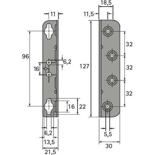 Het hoekbedbeslag is voor geschikt voor hoge bedkanten. De schroevengaten zijn in 32 mm rasterafstand.