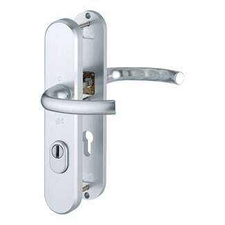 Aluminium afgerond inbraakwerend deurkrukgarnituur van massief aluminium, met rondom facet, conform DIN 18257 en NEN 5089, SKG®***-keurmerk. Buitenzijde met cilinder-kerntrekbeveiliging en stalen nokken, deurkruk met HOPPE-profielwisselstift. Binnenzijde voorzien van hooghoudveer en met zichtbare bevestiging met 3 x M6 kruiskop Bouten en deurkruk-gatdeel. Links en rechts bruikbaar.